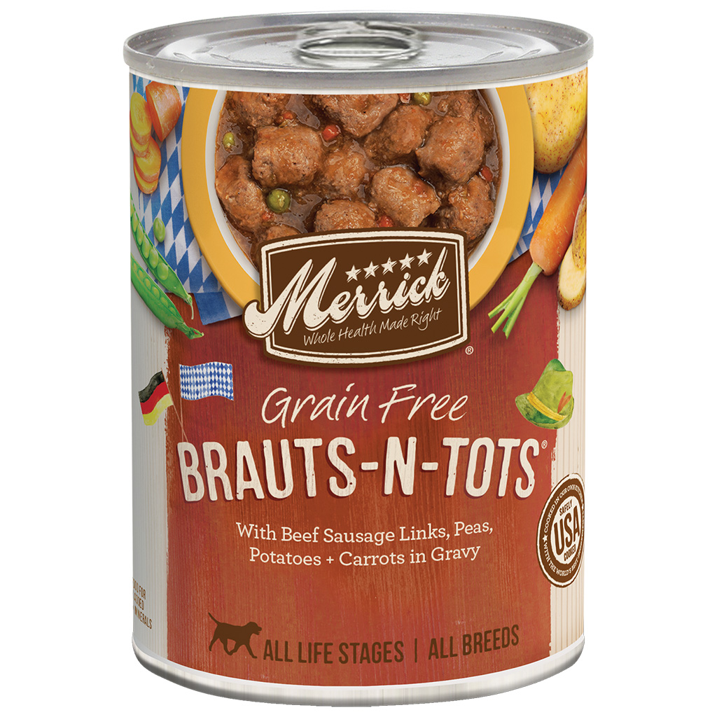 Merrick Brauts – N – Tots Canned Dog Food’s first ingredient is always big pieces of real, deboned USDA inspected beef. This grain-free recipe also has peas, potatoes and carrots all mixed in with a delicious gravy guaranteed to make any mealtime special. All Merrick canned recipes can be served as a topper for dry kibble or a nutritious standalone meal.