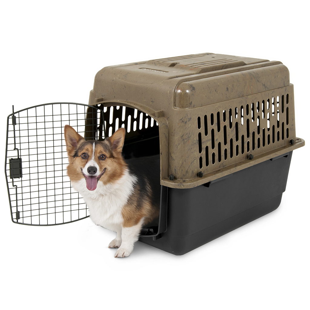The solid, dependable construction and 360-degree ventilation of a Ruffmaxx® Kennel for dogs and cats allow comfortable security and plenty of fresh air for your pet on the road or at a campsite. A camo colored top and black base make this kennel a perfect retreat or travel space for your four-legged outdoor enthusiast. The durable plastic shell comes with heavy-duty, easy-to-assemble wing nut and bolt hardware. Metal door with squeeze latch, door-pull barriers for strength and safety. Constructed using quality plastic for strength and safety.